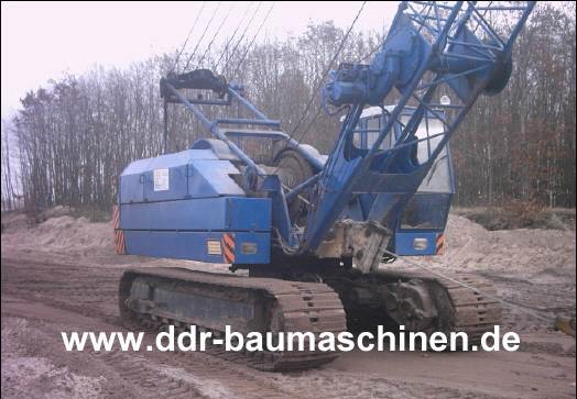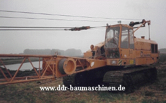 Als kleinster Seilbagger (0,25 cbm Klasse), ging in den sechziger Jahren der KM-251 an den Start. Gebaut als Lizenz der englischen Marke Priestman in den Warynski Werken in Warschau, kam der KM-251 aber nur im Meliorationswesen zum Einsatz, wo er sich unter allen Umständen bewährte. Angetrieben wurde der KM-251 von einem 2- Zylinder luftgekühltem Viertaktdieselmotor vom Typ 2 KVD-14,4 SRL mit 22 PS, (es standen auch Motoren von Skoda und Lister zur Auswahl) der über eine Hauptkupplung und ein Kettengetriebe seine Kraft auf eine Wendegetriebe übertrug. Vom Wendegetriebe verzweigte sich die Kraft dreifach zum Drehwerk, zum Fahrwerk und zum Seilwindwerk, das aus einer Einfach und einer Doppeltrommelwinde bestand. Im landwirtschaftlichen Wasserbau eignet er sich besonders durch seine Vielzahl an Ausrüstungsmöglichkeiten, von der Tieflöffel, Zugschaufel und Greiferausrüstung bei der Herstellung von trapez- und rechteckförmigen Grabenprofilen, sowie mit einem speziellen Dränlöffel zur Herstellung von Drängräben. Bei einer Länge von 2530 mm, einer max. Auslegerlänge von 11 m sowie einem Gewicht von ungefähr 8 t und einem Grundpreis von 56000 Mark der DDR, gehörte der KM-251 nicht gerade zu den größten Seilbagger. Eingesetzt fast ausschließlich zur Grundräumung der Vorfluter in der Landwirtschaft haben sich die KM,s einen Namen gemacht und manche Maschinen waren im Jahre 1989 30 Jahre und älter. Heute sieht man sehr selten noch einen KM-251 und er gehört schon eher ins Raritätenkabinett.  |
